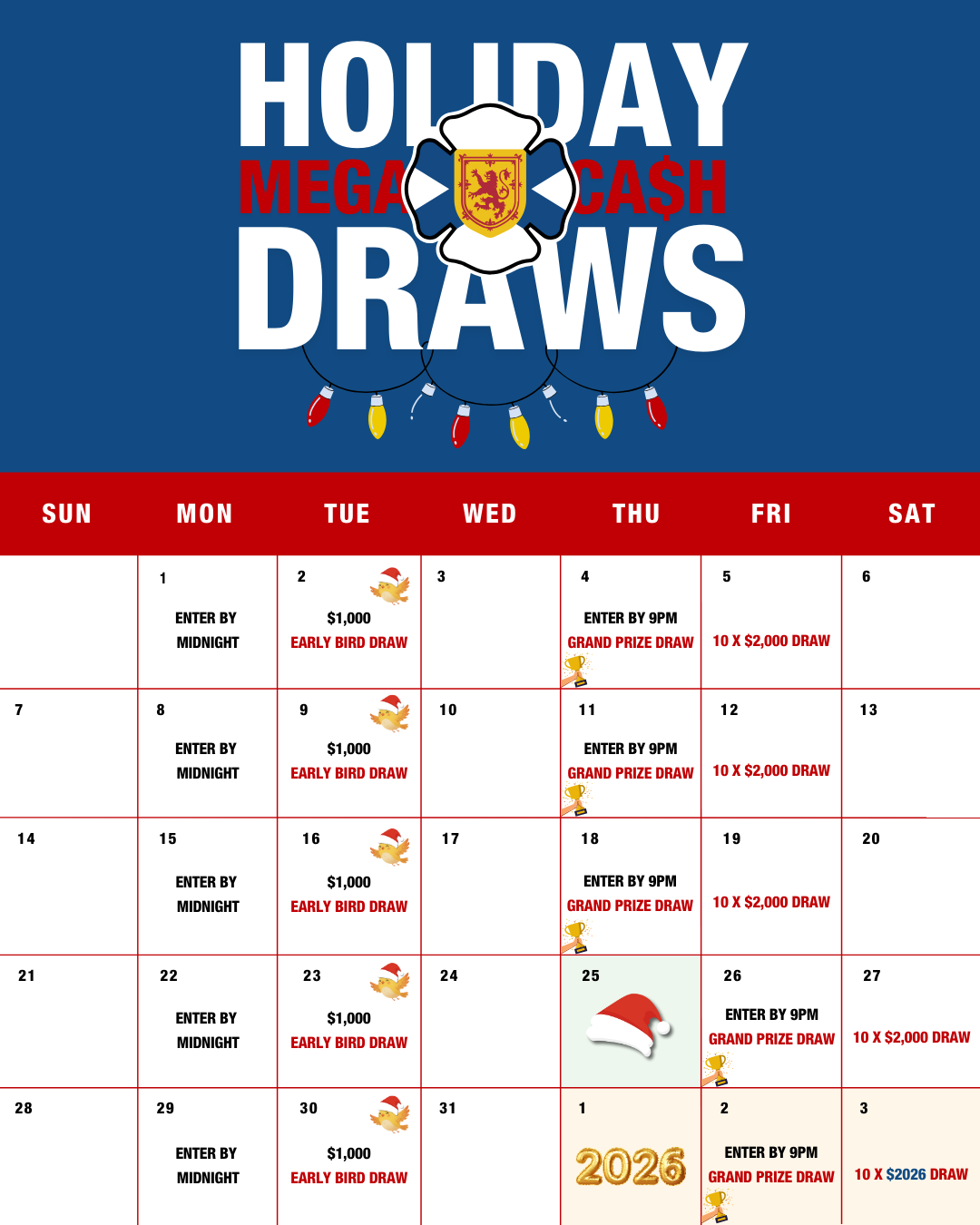 December has always been a big prize month for the weekly 50/50 draw and the Mega Cash draws are back once again. Click here for the calendar of draws.